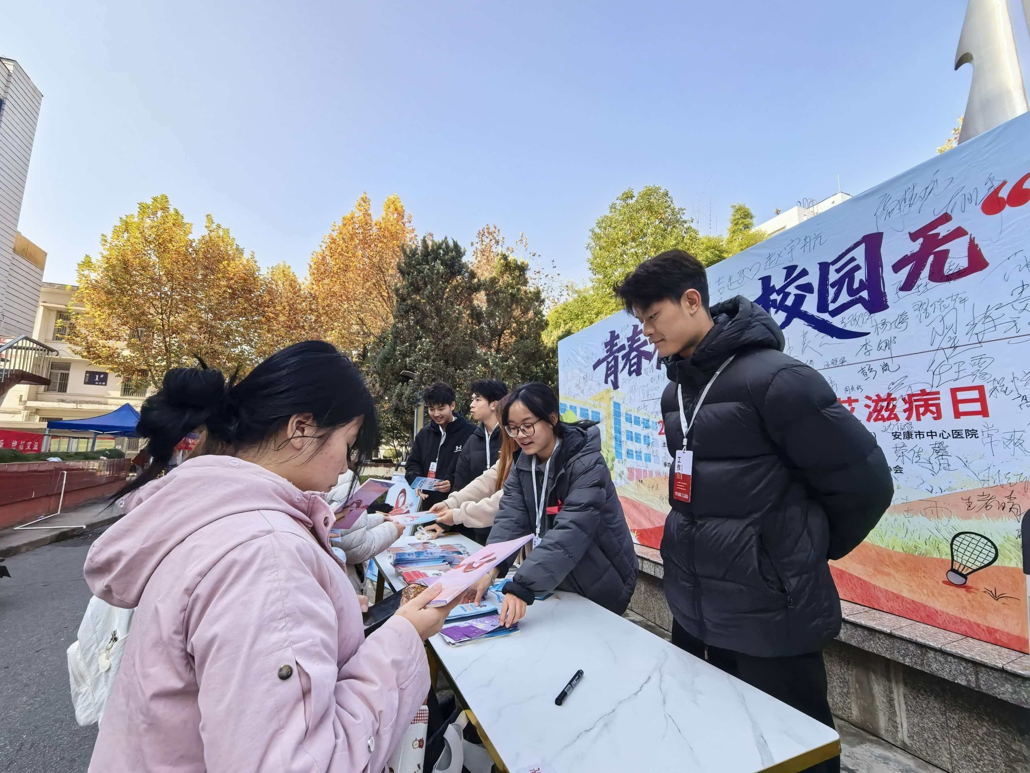 11月27日,“青春有爱,校园无艾”主题签名活动在江南校区接力举行。千余名师生佩戴手工红丝带,有序在横幅上郑重签名,以青春承诺践行防艾责任。活动创新设置“承诺+科普+服务”三大功能区,实现防控宣传闭环覆盖:科普宣讲区由市、区疾控专家坐镇,通过“谣言粉碎机”互动环节澄清“日常接触传染”等认知误区,用可视化数据图表呈现严峻态势;物资发放区累计发放防艾文创、宣传手册等物料4000余份;匿名咨询区则由市中心医院医护人员提供一对一健康指导与心理疏导,传递“防艾不防心”的人文关怀,切实消除师生对艾滋病患者的歧视与恐惧。