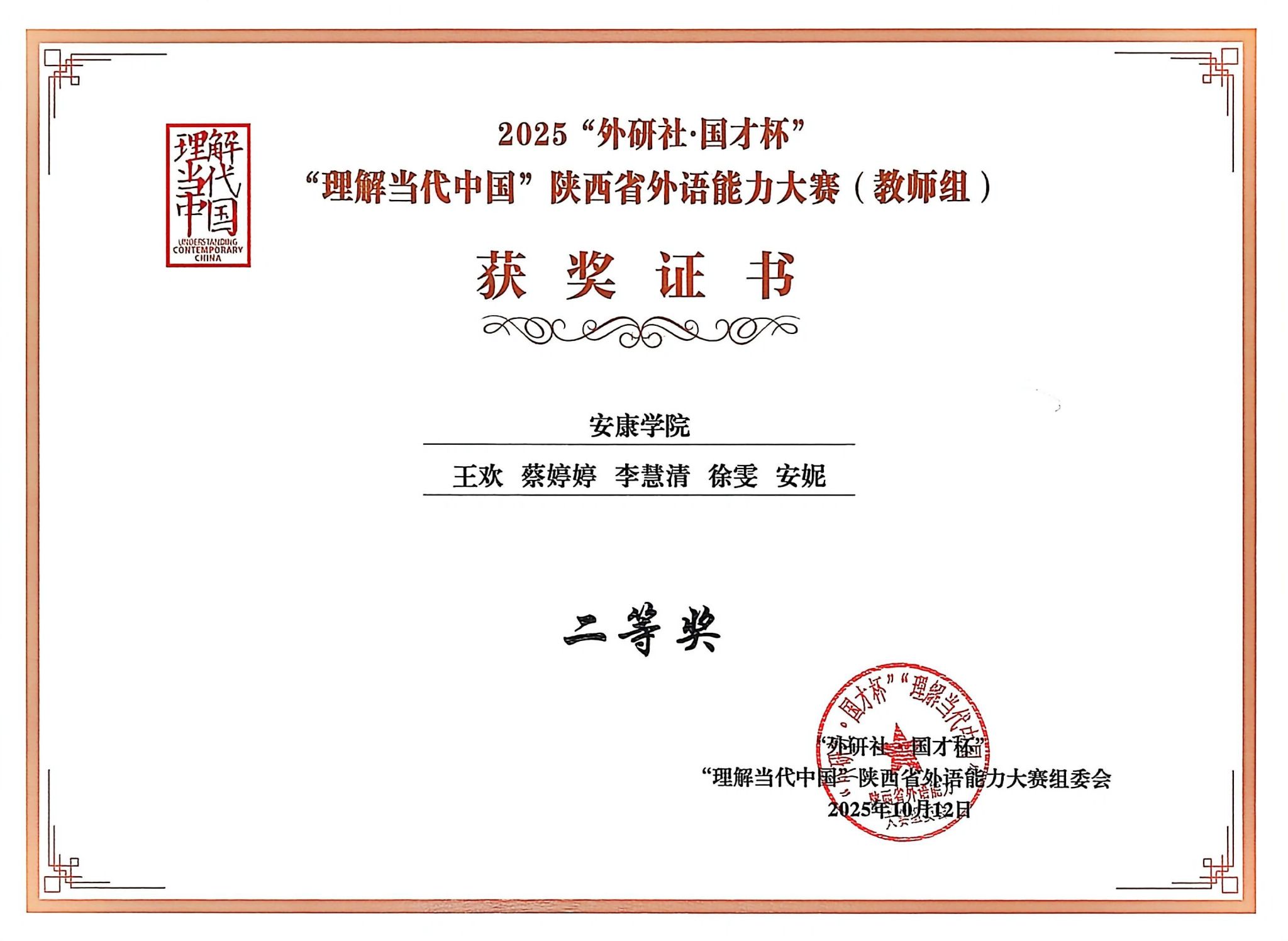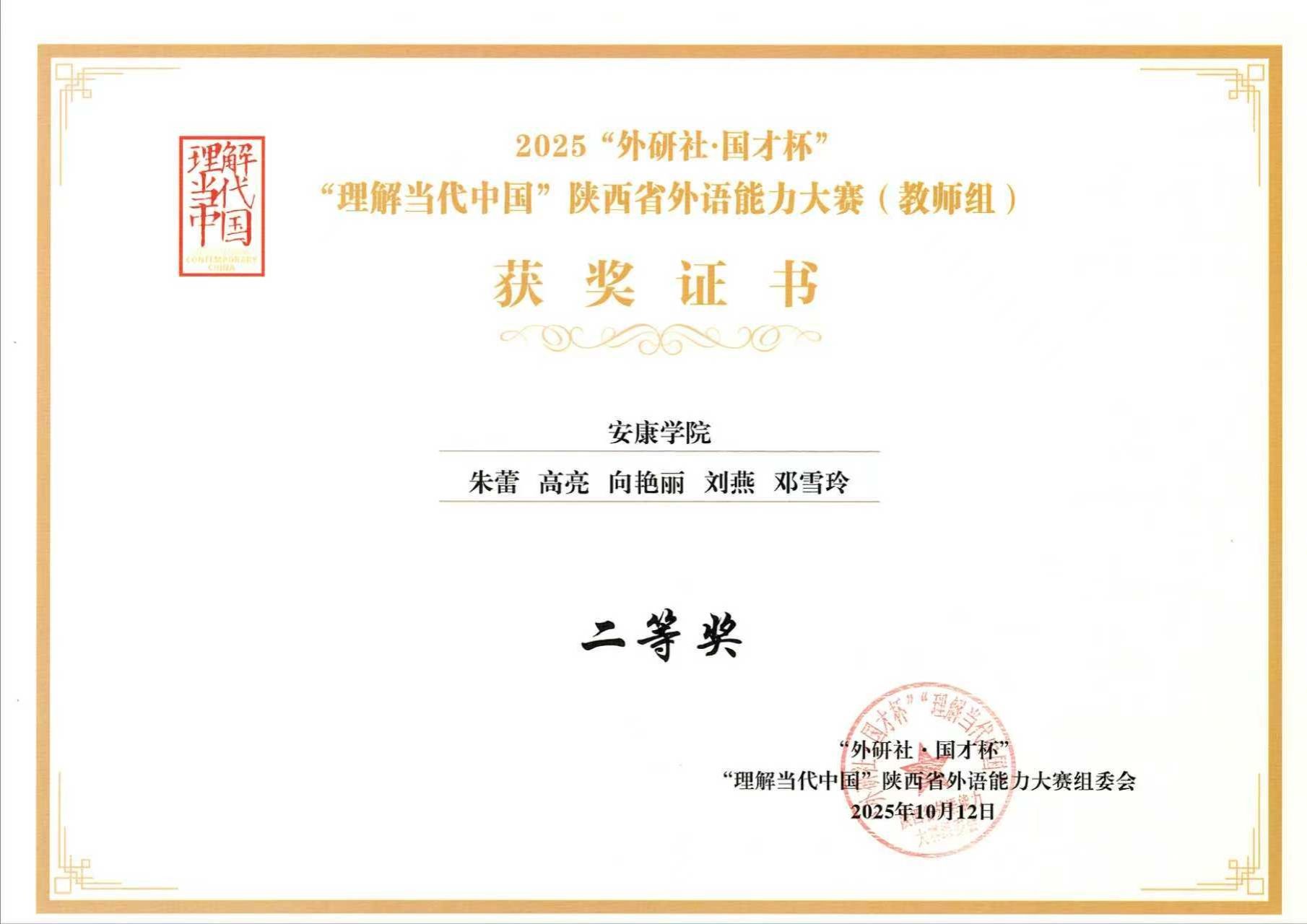 近日,2025“外研社国才杯”“理解当代中国”陕西省外语能力大赛(教师组)获奖名单公布,我校外语学院英语专业教学团队(王欢、蔡婷婷、李慧清、徐雯、安妮)、大学英语教学团队(朱蕾、高亮、向艳丽、刘燕、邓雪玲)均荣获陕西省二等奖。