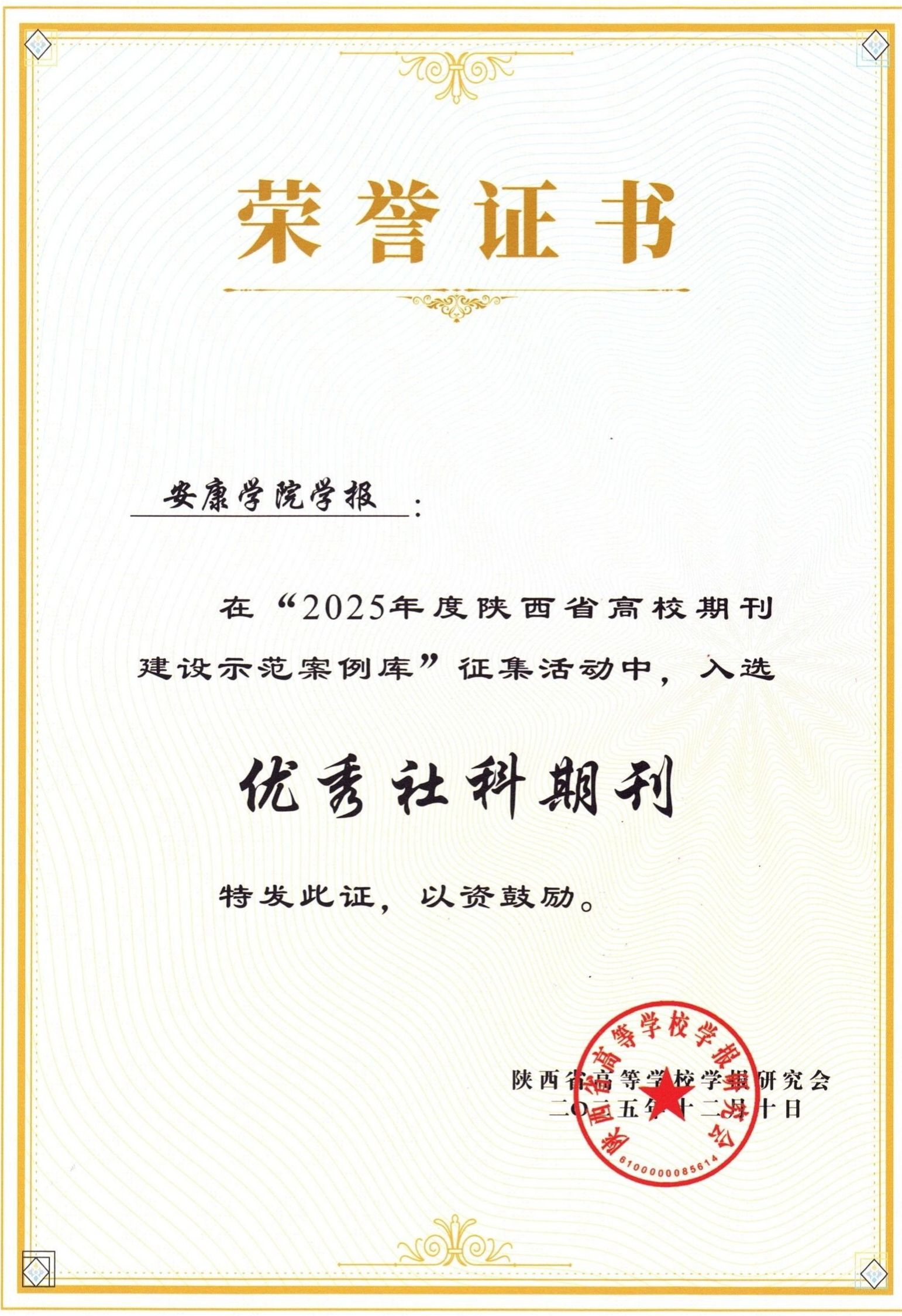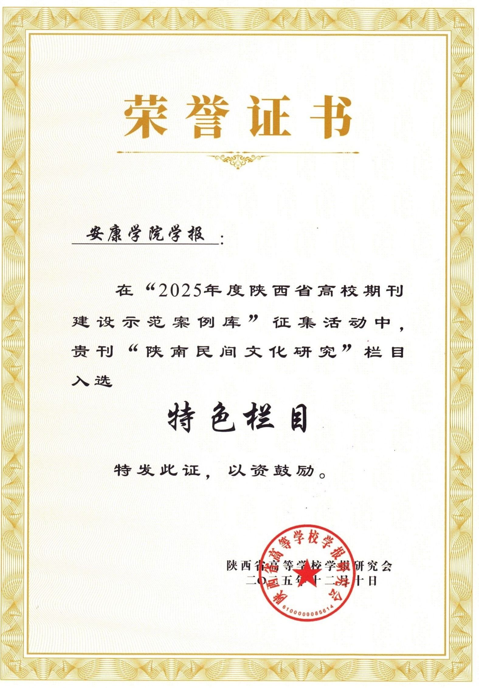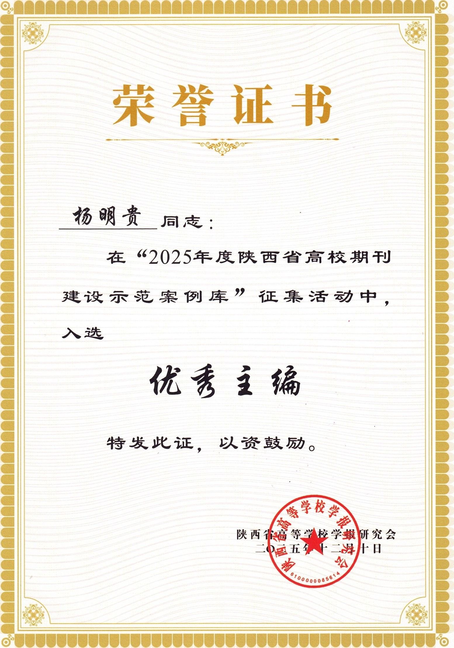 近日,陕西省高等学校学报研究会九届六次理事会暨2025年秋季学术年会在杨凌召开。会议公布了“2025年度陕西省高校期刊建设示范案例库”征集评选结果。我校学报入选“优秀社科期刊”案例,“陕南民间文化研究”栏目入选“特色栏目”案例,编辑部杨明贵同志入选“优秀主编”案例。