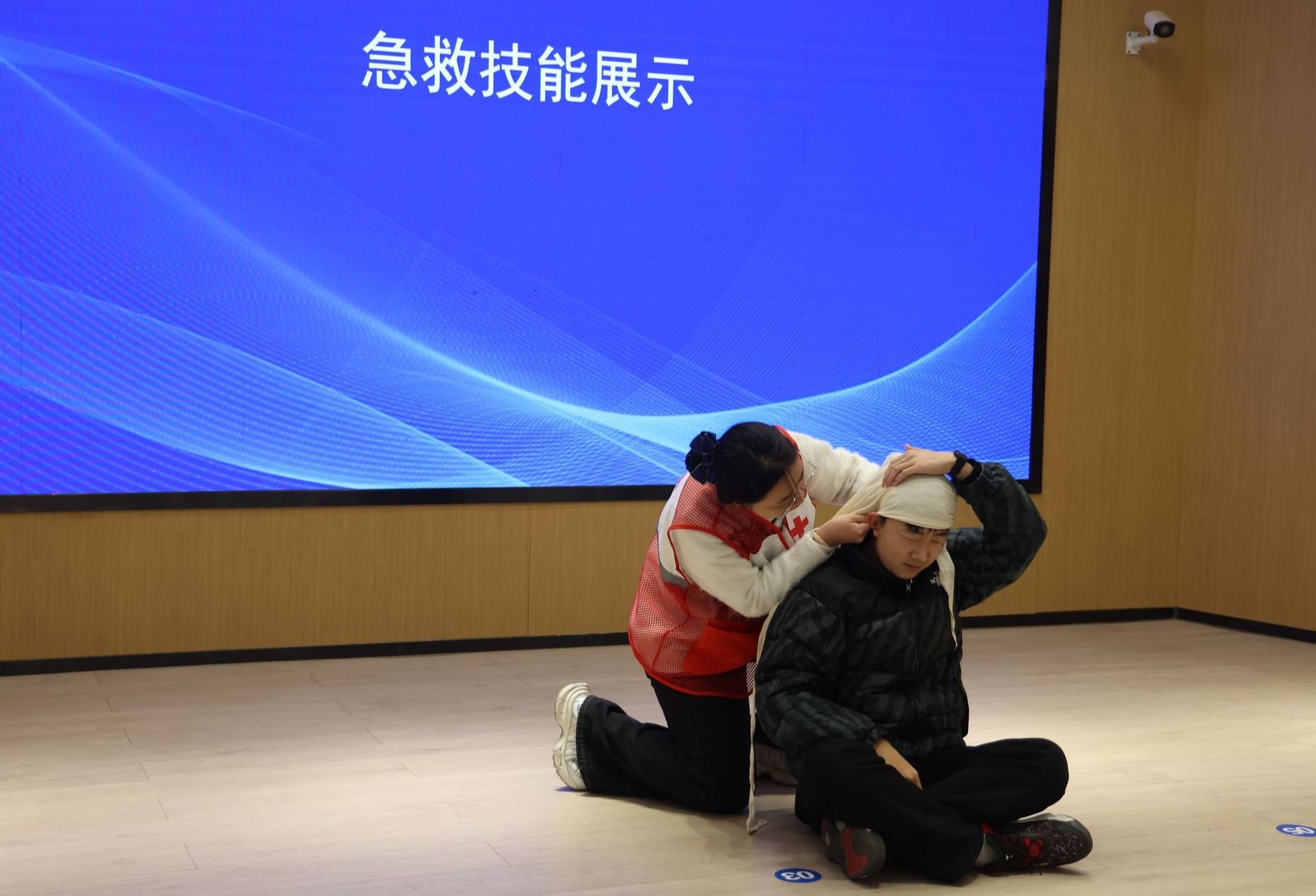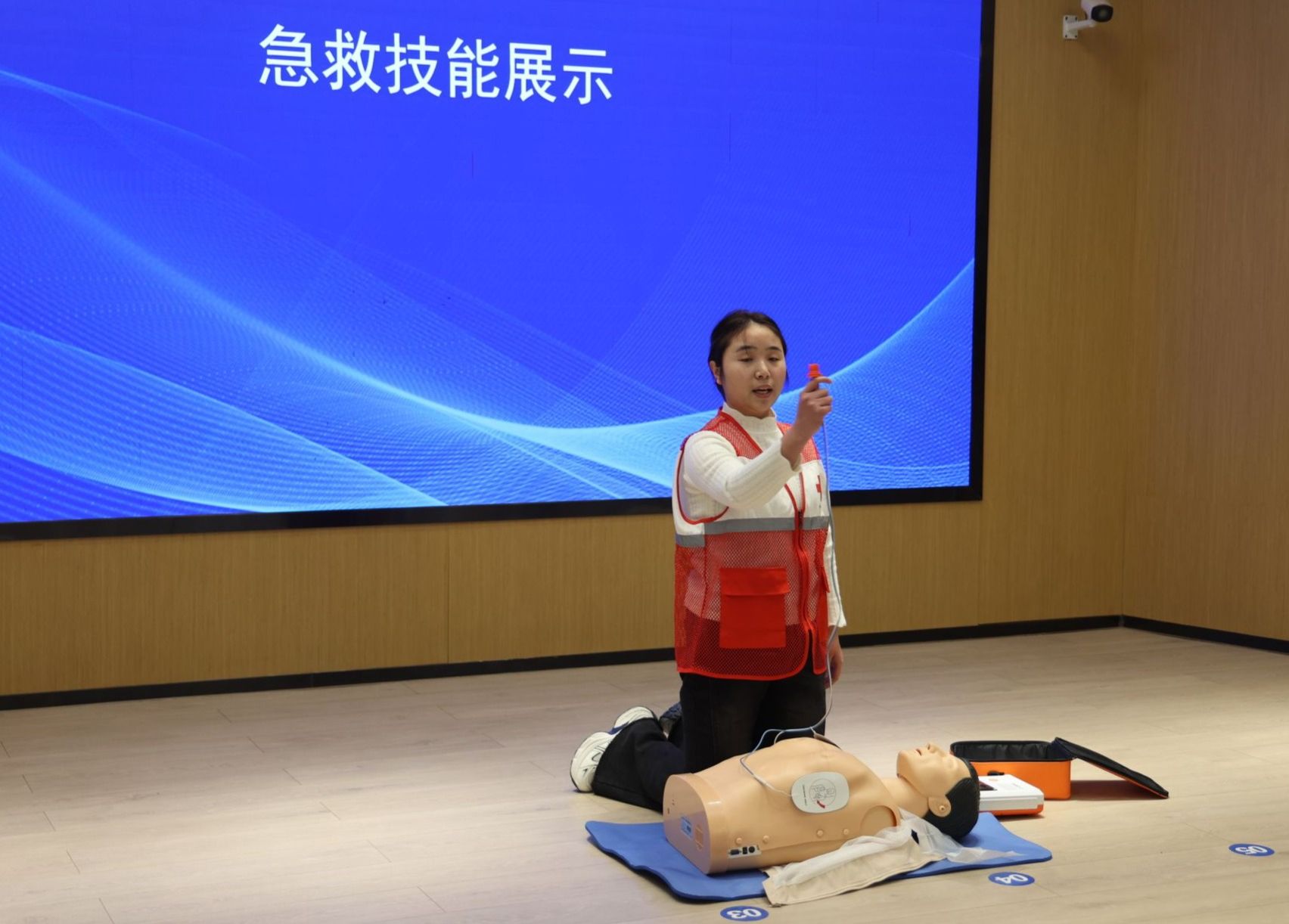 任鹏、钟生海、冉远富分别为AED投放单位代表颁发自动体外除颤仪;杨首艳向安康学院红十字志愿服务队授旗,鲜红的队旗在现场传递出守护生命的责任与担当。在AED展示环节,我校医学院学生现场演示成人心肺复苏(CPR+AED)、头部外伤包扎急救技能,标准规范的操作流程、沉着冷静的应急处置,赢得了在场人员阵阵掌声,直观展现了校园急救知识普及的丰硕成果。