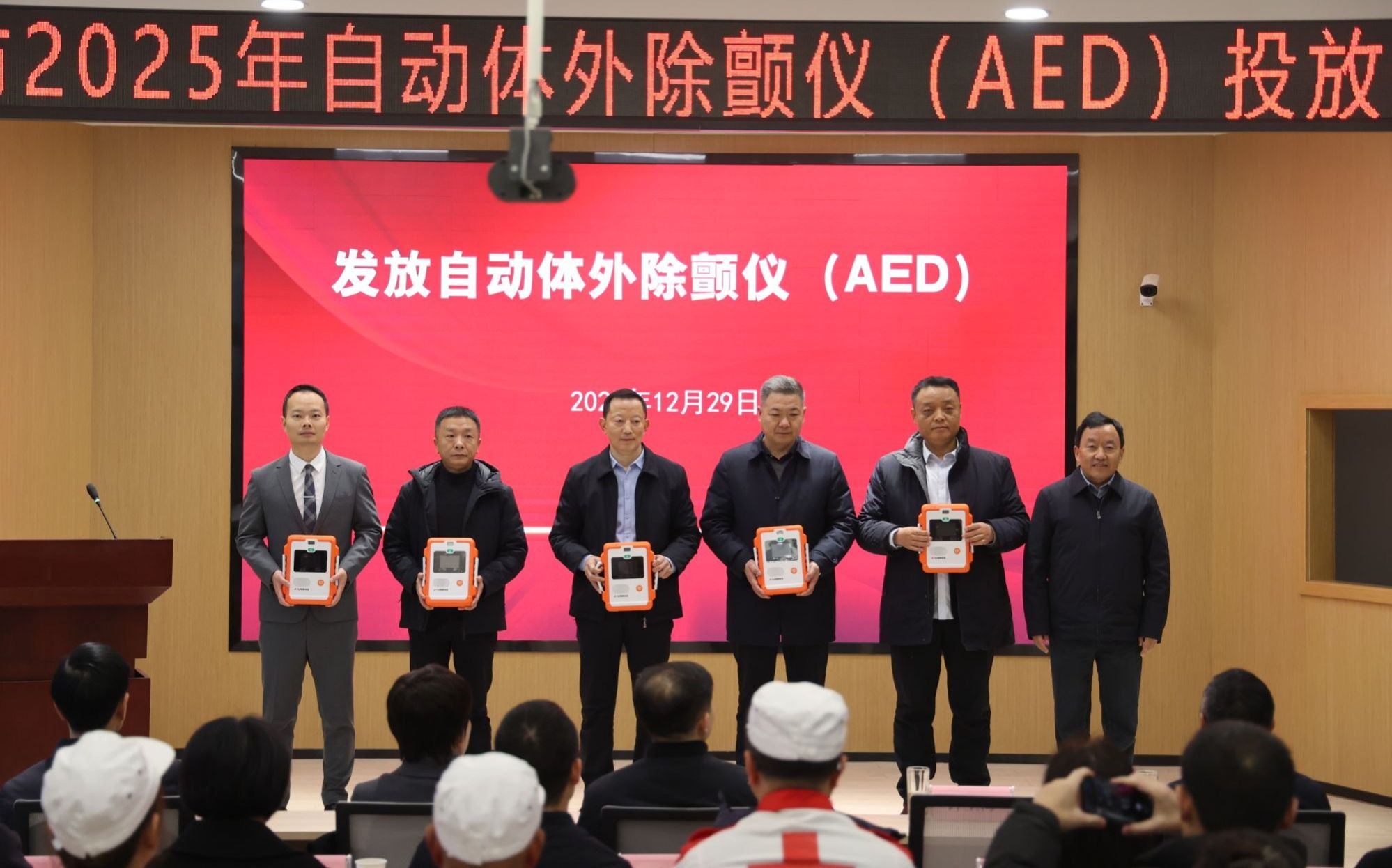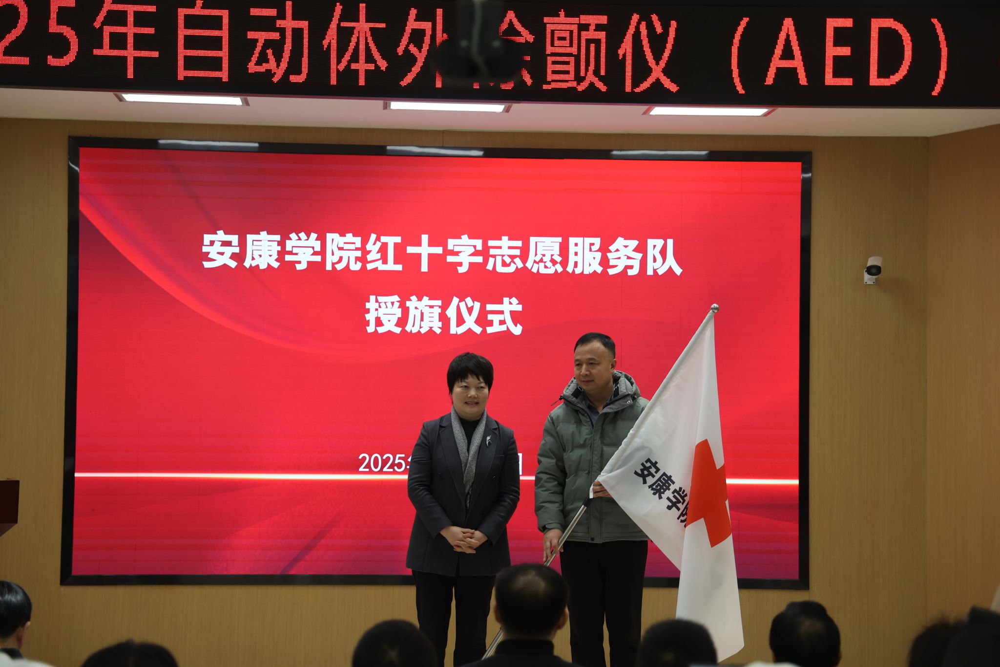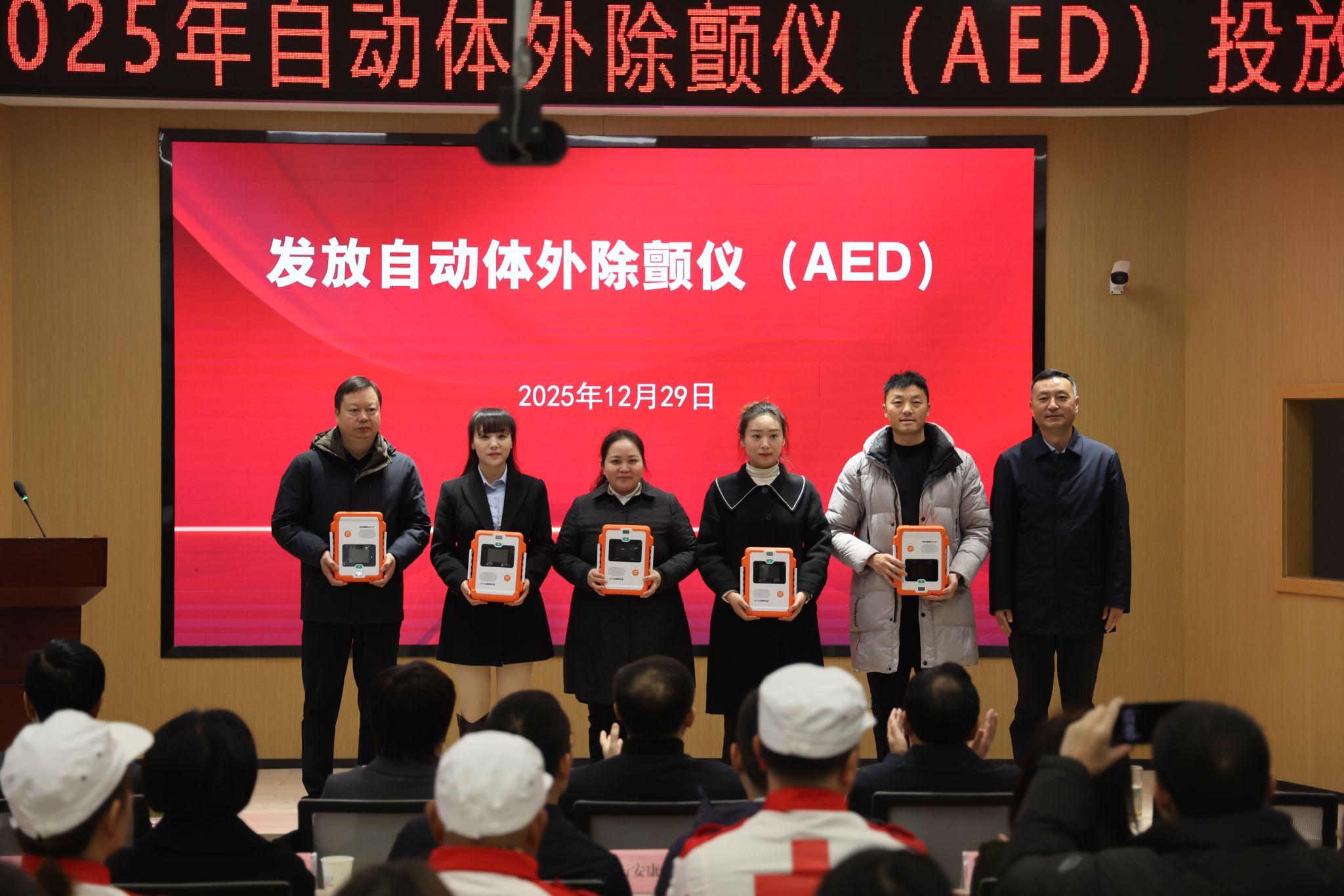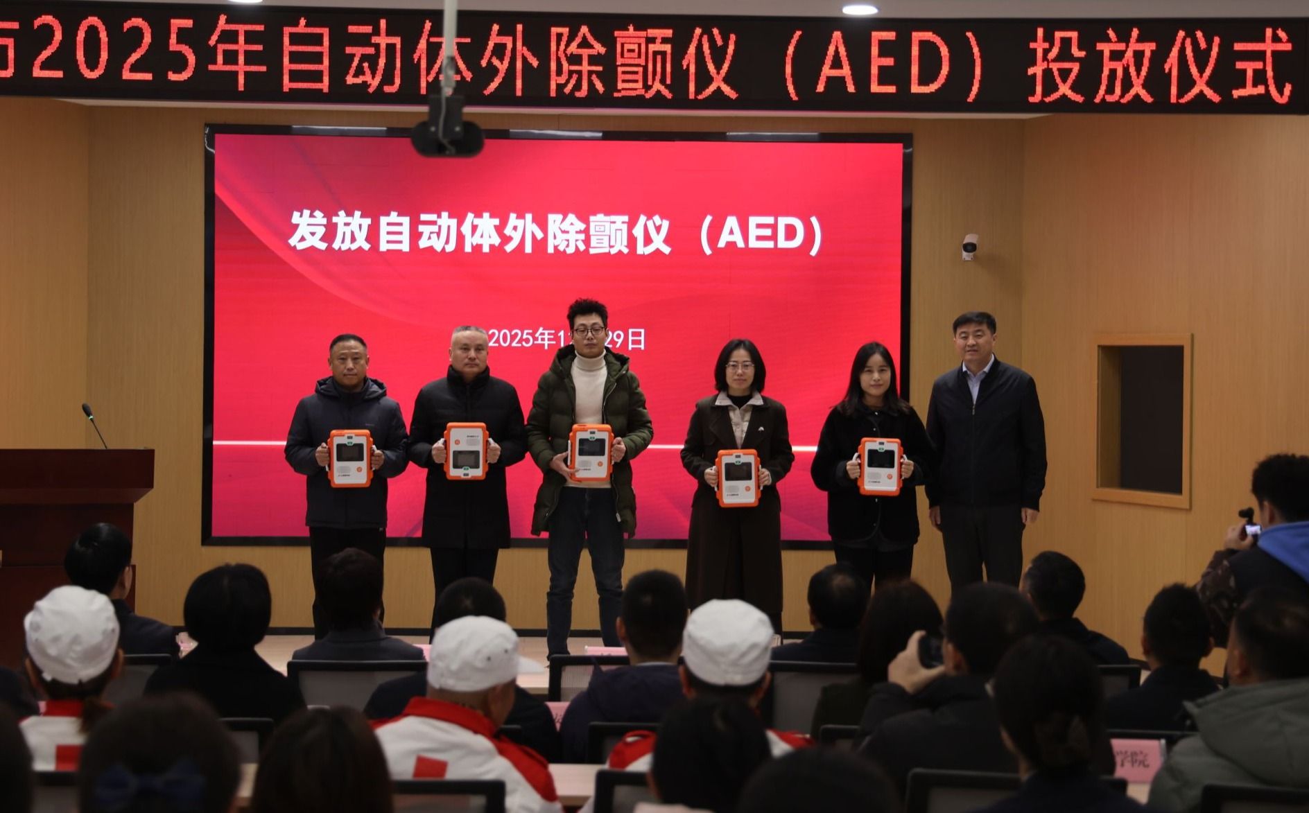 12月29日上午,安康市2025年自动体外除颤仪(AED)投放仪式在我校江北校区乡村振兴学院多功能报告厅举行。安康市副市长任鹏、杨首艳、市政府副秘书长冉远富,我校党委书记钟生海、副校长屈险峰出席仪式。市红十字会、市级相关部门负责同志,AED各投放单位代表,市红十字救援队、志愿服务队队员,应急救护师资及我校红十字青年代表等近百人参加活动。