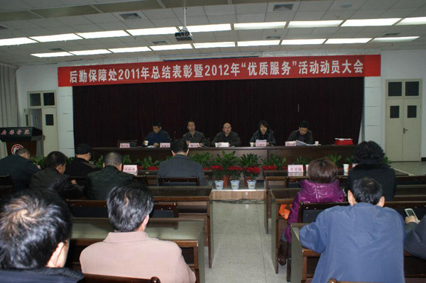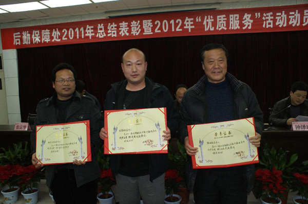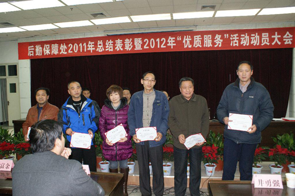 会上,组织部专职组织员于咏梅宣读学院党委有关文件和后勤集团更名为后勤保障处后的部门工作职责。后勤保障处副处长郭家平对部门2011年度工作进行了总结报告,对2012年工作和优质服务活动作了安排布置。后勤保障处副处长钟泽斌宣布了对4个先进服务单位和34个先进个人的表彰决定。与会领导为受表彰的集体和个人颁发了荣誉证书。