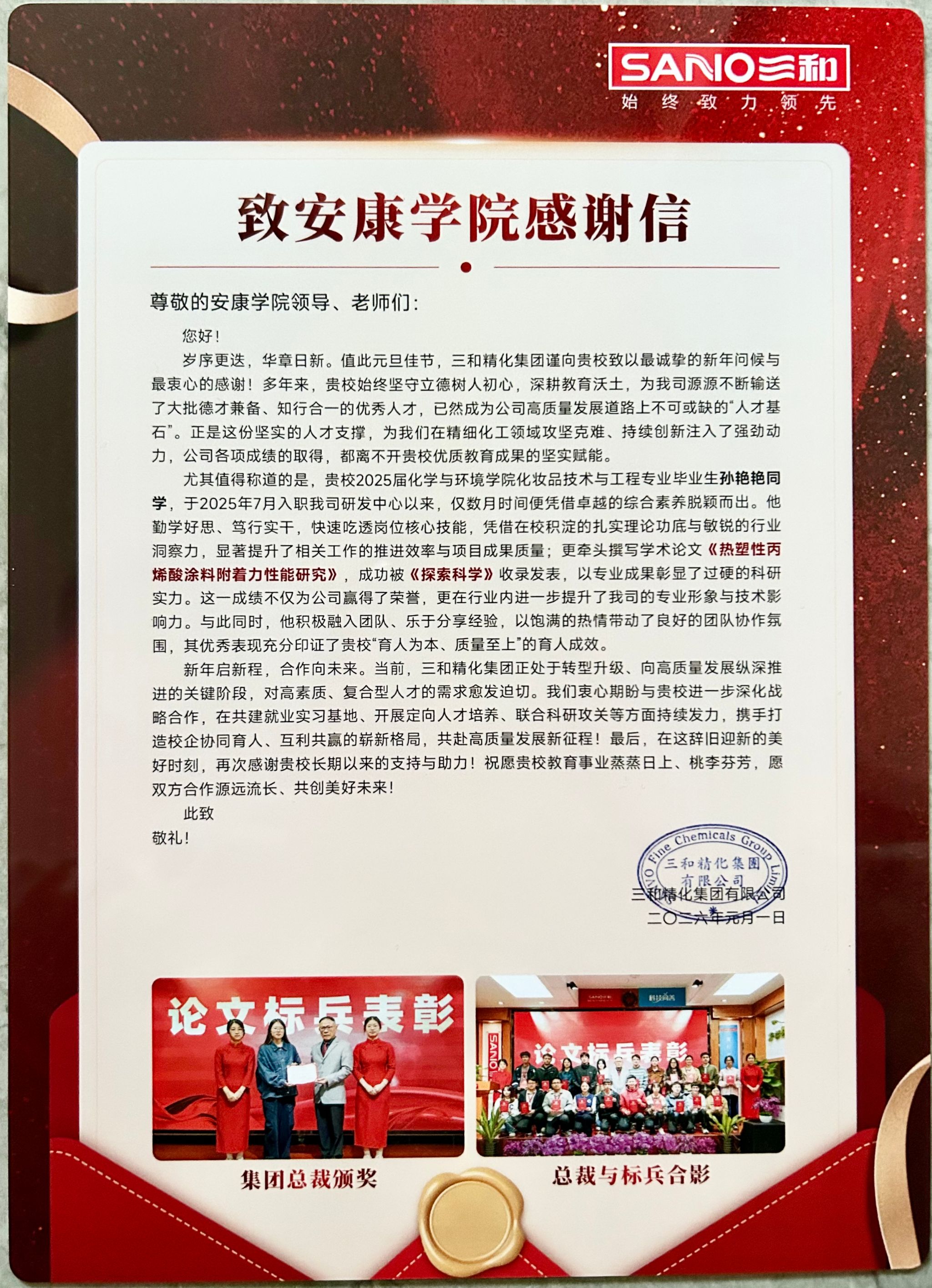 近日,三和精化集团有限公司向我校发来感谢信,对学校人才培养方面的相关工作表示感谢,并特别赞扬化环学院2025届毕业生孙艳艳在工作中表现出的扎实专业素养与良好团队协作能力。