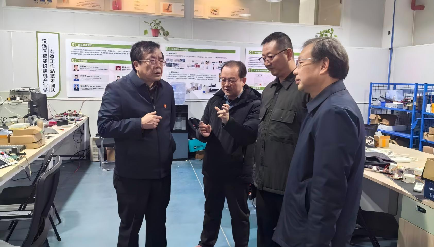 期间,余劲一行专程走访了寒假期间仍奋战在一线的智能织袜机产业链专家工作站,亲切看望了我校兼职教授张团善及其团队成员,对他们坚守产业前沿、潜心推动智能织造技术攻关的精神与成果表示高度赞赏。