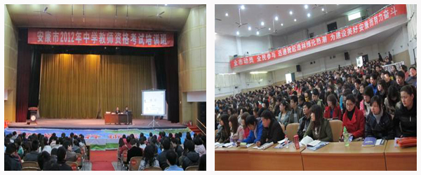 3月24上午,安康市2012年中学教师资格认定考试培训班在我校西校区隆重开班。在未来的8天时间里,有志献身中学和中职教育事业的1000多名学员,将接受教育学、教育心理学、职业道德、政策法规四门课程的专业辅导。