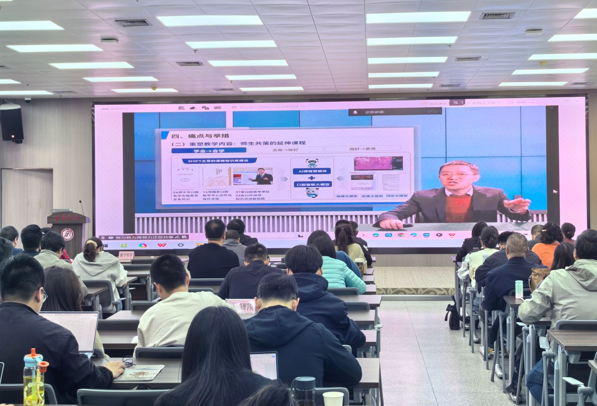 培训邀请四川大学李春洁教授作专题分享,他以《SHIFT模式与AI智慧课程建设为核心的教学创新》为题,结合《口腔颌面外科学》课程实践,拆解了AI赋能教学的具体路径。该课程通过构建SHIFT体系、革新教学方法、创新案例教学等举措,引导学生提升综合能力,既为日常教学提供了创新思路,也为教师备赛提供了实用参考范式。