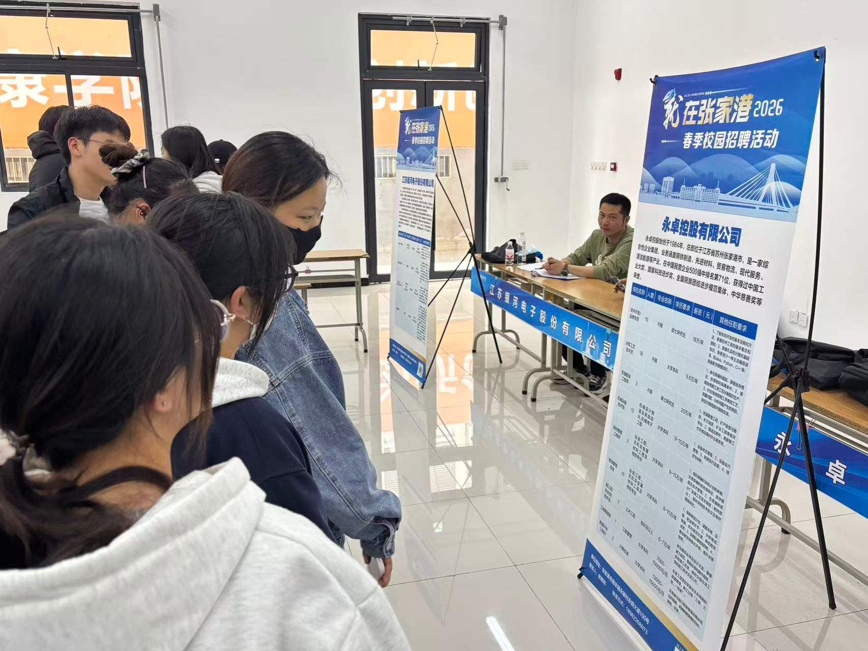 为深入落实学校就业工作部署,精准抢抓春季促就业黄金窗口期,4月11日,由化环学院承办的我校2026年“就在张家港”校园专场招聘会在江北校区顺利举办。学工部及各相关二级学院负责人到场指导,校企协同助力毕业生求职。