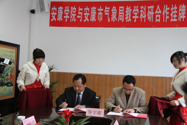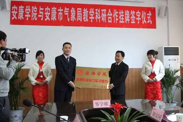钟生海与崔鑫代表各自单位进行了“安康学院地理专业实习实训基地”授牌交接。向纪明、王毅分别代表安康学院和安康市气象局签订了教学科研合作协议。根据协议约定,双方将在人才培养、科研攻关、学术交流、资源共享等方面进行深入合作。
