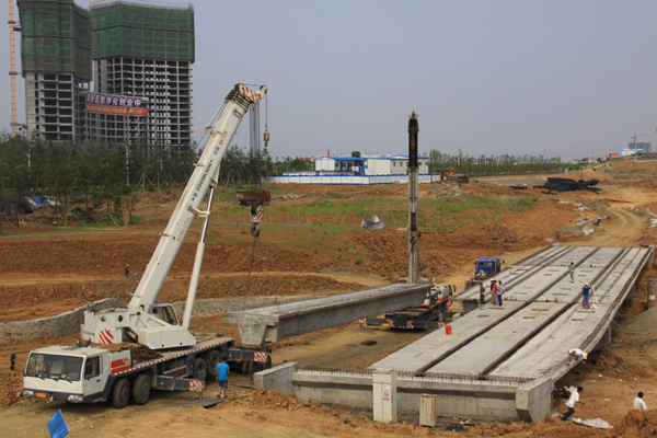 为确保今年9月入住新校区总体目标要求,该工程自11年10月开工建设以来,在指挥部基础设施建设办公室的精心组织下,承担工程建设的陕西建工集团机械施工有限公司,克服了雨水较多,施工道路不畅,场地交叉施工等不利因素,经过半年的奋战,于20日完成了最后一根预制大梁吊装,实现了桥梁主体工程合拢。为新校区校园道路及附属设施建设打下了坚实的基础。