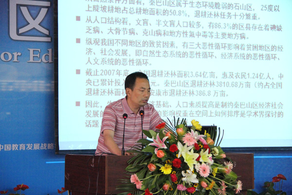 安康学院政治与历史系主任何家理教授作了《教育移民减轻资源环境承载压力是贫困山区扶贫的必然路径选择——安康市教育扶贫模式实证研究》调研报告。报告对安康市贫困原因进行了分析,指出“教育移民减轻资源环境承载压力”是安康市扶贫的必然路径选择。对安康市探索教育扶贫途径中形成了一系列亮点和特色进行了总结,对基础教育中随着国家惠民政策的实施出现的一系列新问题进行了分析并提出了应对之策。