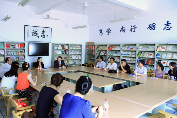 Mark Disney与陈刚代表双方签署合作办学协议并为合作办学揭牌。签字仪式结束后,Mark Disney先生、颜洁女士和温来纲先生跟外语系师生还进行了座谈。
