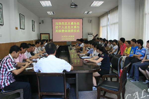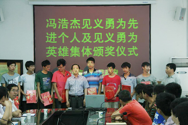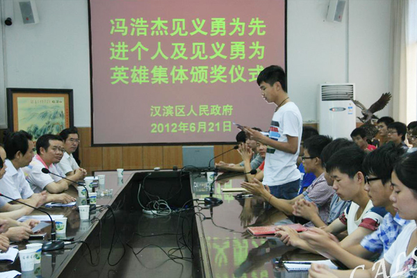 区政法委书记阮家军宣读了先进表彰决定:授予赵开平等8名见义勇为学生先进个人荣誉称号,并颁发了奖状和奖金,授予2011级园林本科班先进集体荣誉称号并颁发奖状。冯浩杰同学的英雄壮举,是当代大学生学习的典范,彰显了当代大学生高尚品德。鼓励当代大学生向他们学习,继承和发扬中华民族的传统美德,为构建和谐汉滨、文明汉滨共同努力,争创辉煌。
