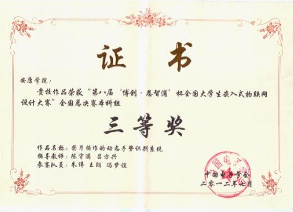 本届大赛在全国设八个分赛区,共计710支队伍报名参赛,经过分赛区严格筛选出100支优秀队伍参加全国总决赛,我校电子与信息工程系电子信息工程2009级学生朱伟、王朗、冯梦谊同学设计,陈守满、吕方兴老师指导的作品《图片操作的动态手势识别系统》代表西北赛区参加全国总决赛,最终获得三等奖的优异成绩。