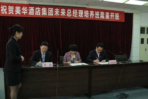 向纪明、黄欣、张倩分别代表学校、美华酒店集团和学员在协议书上签字。根据协议,未来店总培养班将实施2.5+1.5学制,在完成本专业课程学习同时开设酒店管理专业课程;美华酒店集团将为学员提供奖助学金、带薪实习实训岗位和就业岗位。