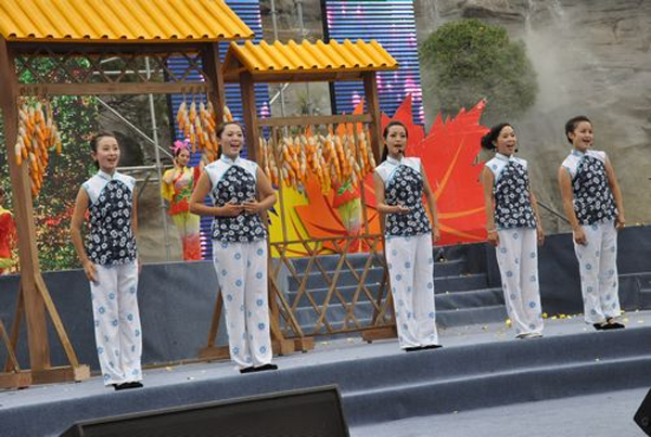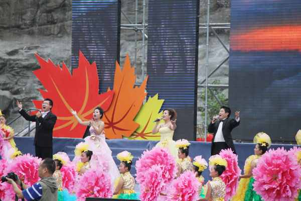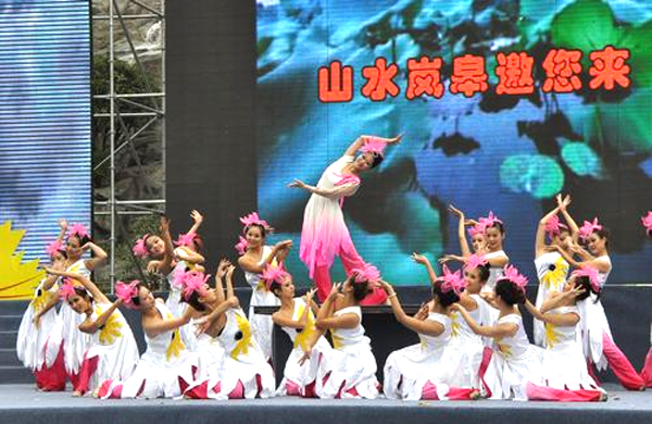竹筏、荷花、艄公、美女......汉调二黄《相约岚河》让观众大饱眼福,让人们在领略岚河优美风光的同时,也感受到了跳动的文化脉搏。乐舞《水舞千层河乐动南宫山》、舞蹈《荷颂》及歌舞《如诗如画南宫山》,将千层河的清、秀、幽与南宫山的雄、奇、险淋漓尽致的展现在观众眼前,把灵山秀水的神奇与美丽悄然根植在了每位观众的心里。民歌联唱《山歌悠长茶飘香》、《山歌不唱冷秋秋》、《六口茶》等脍炙人口的岚皋原生态民歌,婉转清畅,充分体现了岚皋民歌的无穷魅力,展现了岚皋丰富多彩的人文风情。由省杂技团表演的杂技钻桶《腾飞的岚皋》高潮迭起,惊险不断,丰富的表情和娴熟的动作让现场观众无不屏气凝神、叹为观止。国家一级演员祖海还登台演唱了在岚皋广为传唱的歌曲《神奇美丽南宫山》。