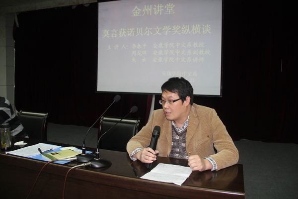 10月23日晚,中文系在图书馆六楼报告厅举办了“莫言获得诺贝尔文学奖纵横谈”专题报告,报告由中文系教授李春平、副教授周龙田、讲师朱云主讲,李春平教授主持。中文系党总支书记李岩、副主任梁卫华、中国文学教研室全体教师及200余名学生出席报告会。