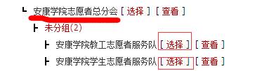 在弹出的对话框内,找到“安康学院志愿者总分会”,单击该名称打开折叠子项,然后按团队的类别进行选择。