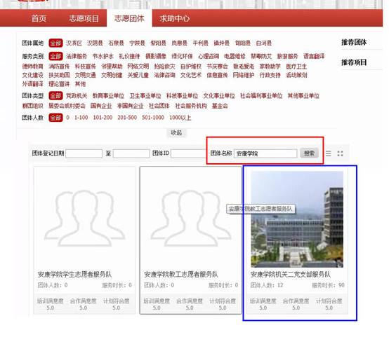 ④在随后出现的页面中,搜索“安康学院”,在下方的团队中,找到自己所属的团队。(下图以“安康学院机关二党支部服务队”为例)