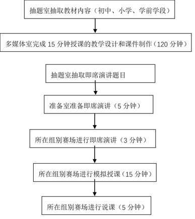 决赛由教学设计(含课件)、即席演讲、模拟授课、说课四个环节构成。大赛设计学段为初中、小学及幼儿园,内容以课程标准为准,不指定教材。大赛总分为100分,其中,即席演讲满分30分,模拟授课满分45分,说课25分。