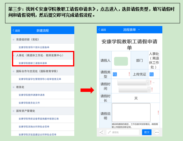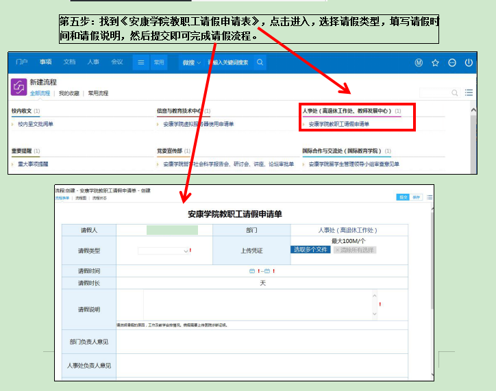 备注: 1.请假流程提交后将会推送至相关领导进行审批,审批完成后会在个人流程中提醒,请注意查看。 2.请假天数按照《安康学院教职工请假规定(修订)》(校发〔2017〕123号)执行。具体提供的附件材料或请假天数等事宜,请向人事科刘老师咨询。电话:3261903。