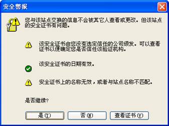 根据IE版本的不同,会弹出不同的安全警报,点击“是”或“继续浏览此网站。”