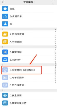 2.在【微信】→【通讯录】→【我的企业及企业联系人】中会显示“安康学院”企业号,点击进入,即可使用【电费缴纳】功能。