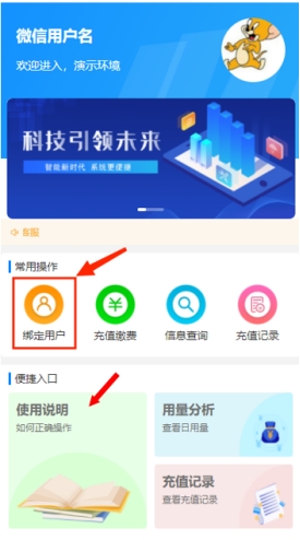 进入缴费系统,点击【绑定用户】输入用户编号(即公寓楼号-宿舍号,如5号公寓楼403宿舍的用户编号就是:5-403),点击【确定】,然后再进行【充值缴费】操作。如有疑问也可查看【使用说明】。