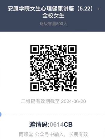 线上分会场:各二级学院设立分会场,组织本学院女生通过“雨课堂”集中观看(下载“雨课堂APP”或者在微信搜索“雨课堂”小程序,扫描二维码或输入邀请码进入课堂)。