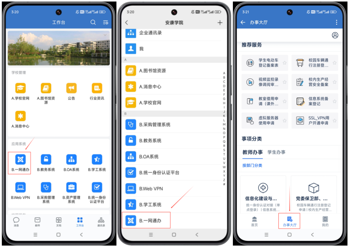 移动端:在学校企业微信APP或者微信企业号插件中,点击“一网通办”,进入办事大厅页面。
