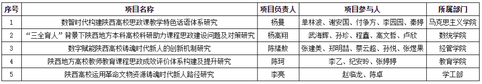 根据陕西省社会科学界联合会《关于陕西省哲学社会科学研究专项2024年度陕西高校思想政治工作研究项目申报的通知》(陕社科联〔2024〕144号)要求,经个人申报、科研处审核、学校组织专家评审,根据评审结果,拟向陕西省社会科学界联合会推荐上报以下5个项目,现予以公示(12月22日-12月24日)。公示期间如对公示对象有异议的可通过书面形式或电子邮件形式向科研处反映,对推荐项目提出异议者需提供有效证据。