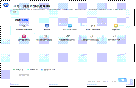 “安小智”简介:“安小智”采用本地化部署,依托DeepSeek云端大模型的自然语言处理与推理能力,通过与“一网通办”平台智能客服系统的深度整合,构建智能化校园服务体系,为师生提供精准高效的信息服务支持,实现校内规章制度、办事流程、通知公告等结构化知识库资源整合,并结合实时联网检索功能,形成智能问答、信息检索与深度推理三位一体的服务架构。系统能够识别用户需求,快速响应课程查询、事务办理等常规问题。
