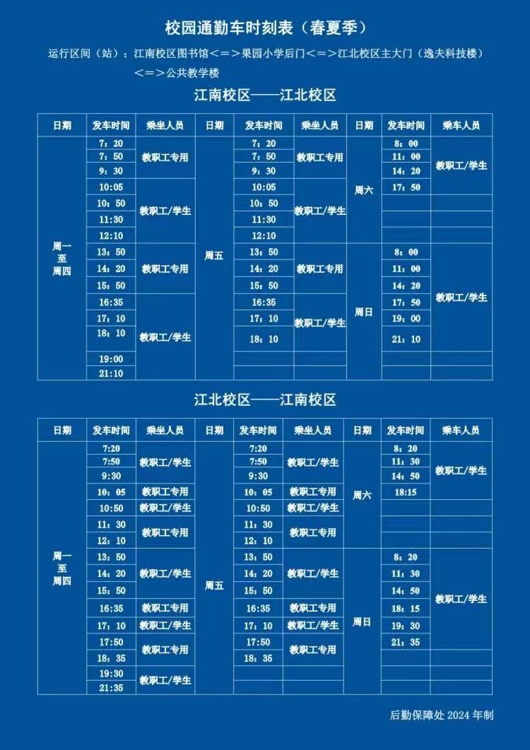 根据学校端午节放假安排,5月31日至6月2日校车暂停运行,6月2日19:00恢复春夏季时刻表运行。