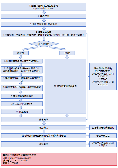 2.考生应在规定时间登录“中国研究生招生信息网”(网址:https://yz.chsi.com.cn,以下简称“研招网”)浏览报考须知,并按教育部、省级教育招生考试管理机构、报考点网上公告要求报名及缴费。报名期间,考生可自行修改网上报名信息或重新填报报名信息,但一位考生只能保留一条有效报名信息。逾期不再补报,也不得修改报名信息。