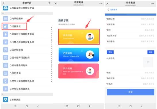 1.全校教职员工可使用访客邀约功能。在“安康学院”企业号或企业微信中进入“D.访客系统”,点击“邀请访客”,根据系统提示填写来访时间段、上传访客人脸照片和基本信息,可点击“添加”邀请多个访客。