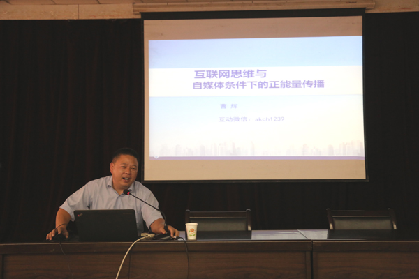 为了加强新媒体概念学习,使新媒体宣传平台在学校宣传工作中发挥更大作用。 6月9日,中共安康市委理论讲师团团长曹辉应邀来我校作题为《互联网思维与正能量传播》专题报告。大学生记者团、广播站成员,相关院系师生共200余人参加了报告会。报告会由副校长向纪明教授主持。