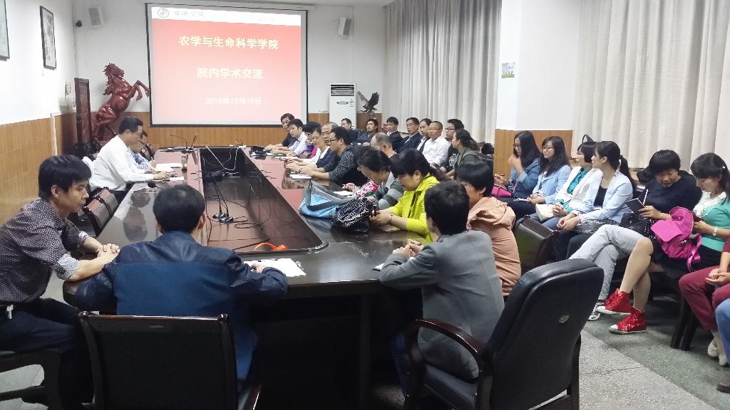 2015年10月19日晚7:30分,农生院首次院内学术交流活动在江南校区第一会议室举行,本次交流活动是农生院院内举办的首次学术交流活动。全院近50名教师参加报告会。院长王军、院党支部书记屈国胜、副院长陈立强出席交流活动。