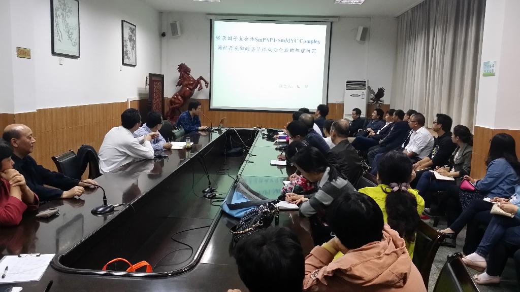 王健博士作了题为《转录因子复合体SmPAP1/SmMYC调控丹参酚酸类活性成分合成的机理研究》的报告,他结合自身及课题组的研究情况和成果,讲述了丹参酚酸类活性成分基础研究的过程。