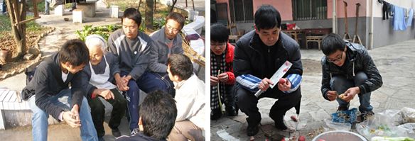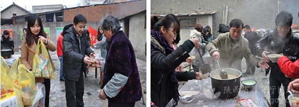 安康学院党委书记杨涛(左图前排右二)在福利院作服务工作,副书记胡鸿晓(右图前排右二)和学生一起为福利院的老人盛腊八粥