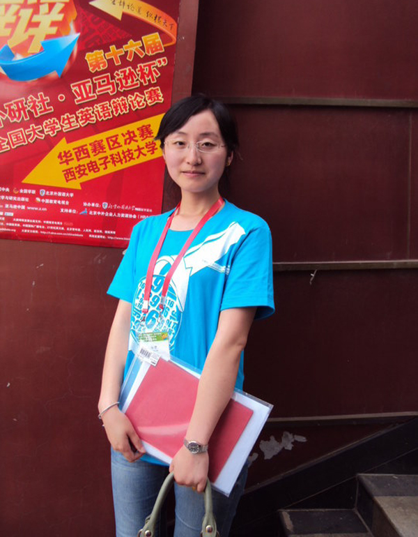 这是陈蕾老师带领我校同学参加2012年的第十六届“外研社•亚马逊杯”全国大学生英语辩论赛华西赛区决赛时的照片。照片中的陈老师额脸上除了一丝疲劳,更多的是欣喜和发自内心的喜悦。大学生英语辩论赛,不同于演讲赛,是交互式的,是选手间语言水平、逻辑思维、知识视域等方面的综合较量。“台上一分钟,台下十年功”,为了这场比赛,陈老师对两位辩手进行了为期一个月的辩论技能培训,选手们也积极准备案例,扩大知识面,增进自己对社会、教育、经济、文化、军事、政治等多领域的认识和判断,促进了逻辑思维能力和多角度思考能力的提升,还进行多场实战演习。在两天5轮循环赛(每轮持续两个小时)的紧张赛程中,选手不畏强队、不惧强压,积极调整心态及迎战策略,最终斩获佳绩,这些都离不开陈老师的辛苦付出和培训。选手们经过紧张培训,蓄势待发的一个月,冲锋陷阵的三天,最终喜得佳绩。陈老师回忆说比赛那三天是亢奋的三天,疲惫的三天,也是收获颇丰的三天。